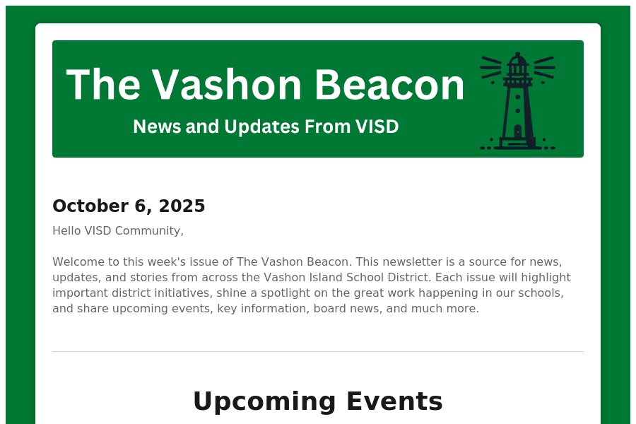 October 6, 2025 Hello VISD Community, Welcome to this week's issue of The Vashon Beacon. This newsletter is a source for news, updates, and stories from across the Vashon Island School Distr. . .